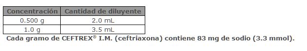 Contraindicaciones: Está contraindicado en pacientes con alergia o hipersensibilidad a otras cefalosporinas. No deben tratarse con ceftriaxona los recién nacidos hiperbilirrubinémicos y prematuros. No diluya CEFTREX® I.M., con soluciones adicionales a las contenidas en la ampolleta contenida en la caja.