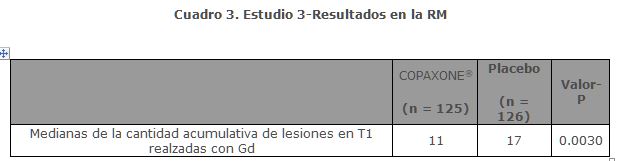 En ambos estudios, COPAXONE® exhibió un claro efecto beneficioso sobre la tasa de recaída, y es basado en esta evidencia que COPAXONE® se considera eficaz. El estudio 3 fue un estudio multinacional en el que los parámetros de resonancia magnética fueron utilizados como criterio de valoración, tanto primario como secundario. Un total de 239 pacientes con EMRR (COPAXONE®: n = 119; y el placebo: n = 120) fueron asignados al azar. Los criterios de inclusión fueron similares a aquellos en el segundo estudio, con el criterio adicional que los pacientes tenían que tener al menos una lesión realzada con gadolinio (Gd) en la RM. Los pacientes fueron tratados de una manera doble ciego durante nueve meses, durante los cuales se sometieron a una RM mensual. El criterio principal de valoración para la fase de doble ciego fue el número total acumulado de lesiones T1 realzadas con Gd a lo largo de los nueve meses. El cuadro 3 resume los resultados de la medida de valoración primaria de seguimiento durante el estudio para la cohorte de intención para tratar.