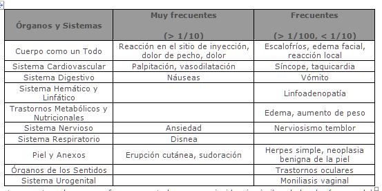 Reacciones secundarias y adversas: Ensayos clínicos controlados con placebo: En todos los ensayos clínicos, las reacciones en el sitio de la inyección fueron las reacciones adversas más frecuentes y fueron reportadas por la mayoría de los pacientes que recibieron COPAXONE®. Las reacciones en el sitio de la inyección reportadas más frecuentemente fueron eritema, dolor, induración, prurito, edema, inflamación e hipersensibilidad. Una reacción asociada con al menos uno o más de los siguientes síntomas: Vasodilatación, dolor de pecho, disnea, palpitación o taquicardia, ha sido descrita como reacción inmediata posinyección. Esta reacción puede ocurrir en minutos posteriores a la inyección de COPAXONE® (ver Precauciones generales). Todas las reacciones adversas (por lo menos un 2% más frecuentes en COPAXONE® vs. pacientes tratados con placebo) son presentadas en la tabla inferior. Estos datos se obtuvieron a partir de tres estudios clínicos pivotes, doble ciego, controlados con placebo, con un total de 269 pacientes tratados con COPAXONE® y 271 pacientes tratados con placebo durante 35 meses.