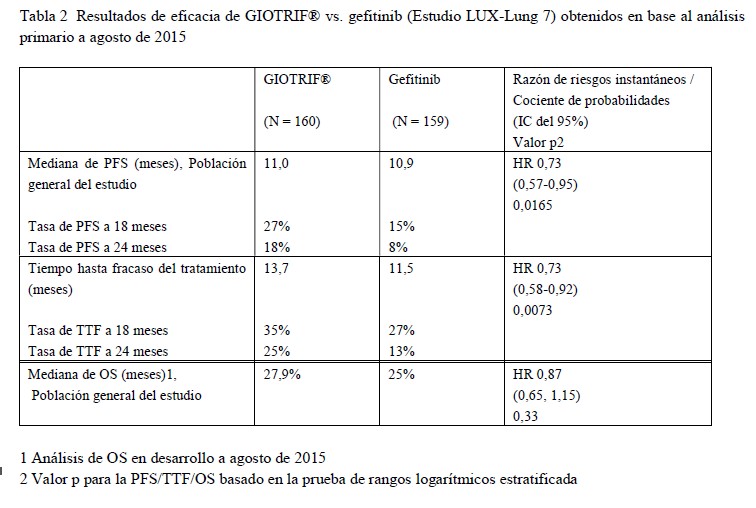 El análisis de la PFS basado en la revisión del investigador arrojó resultados similares (mediana de PFS 11.1 vs. 6.7 meses, HR = 0.49, p < 0.0001) a los de la revisión independiente. El efecto sobre la PFS fue concordante dentro de los principales subgrupos, lo que incluyó el sexo, la edad, la raza, el estado ECOG y el tipo de mutación (L858R, Del 19) tanto en la revisión independiente como en la revisión del investigador. Sobre la base de la revisión del investigador, la ORR fue 69.1% vs. 44.3% y la DCR fue 90.0% vs. 82.6% en los pacientes tratados con GIOTRIF® en comparación con aquellos tratados con quimioterapia. En el subgrupo predefinido de mutaciones comunes (Del 19, L858R) para GIOTRIF (N = 203) y quimioterapia (N = 104), la mediana de OS fue 31.6 meses frente a 28.2 meses (HR = 0.78, IC del 95% (0.58, 1.06), p = 0.1090). En el subgrupo pre-definido de mutaciones, la mediana en SG en primera línea con GIOTRIF® vs quimioterapia fue de 33.3 meses vs 21.1 meses (HR = 0.54, (95% CI 0.36-0.79), p = 0.0015 en pacientes con Del 19 (n = 169) y 27.6 meses vs 40.3 meses (HR = 1.30, (95% CI: 0.80-2.11), p = 0.2919) en pacientes con L858R (n = 138). El beneficio en términos de PFS estuvo acompañado por una mejoría en los síntomas relacionados con la enfermedad, según lo determinado mediante los Cuestionarios de Calidad de Vida (Quality of Life Questionnaires) (QLQ-C30 y QLQ-LC13) de la Organización Europea para la Investigación y el Tratamiento del Cáncer (European Organization for Research and Treatment of Cancer, EORTC). GIOTRIF® prolongó significativamente el tiempo hasta el deterioro de síntomas preespecificados de tos (HR 0.6; p = 0.0072) y disnea (HR 0.68; p = 0.0145) a razón de más de 7 meses en comparación con la quimioterapia. El tiempo hasta el deterioro del dolor también se prolongó con GIOTRIF®, pero no alcanzó un grado de significación estadística (HR 0.83; p = 0.1913). Se observó un porcentaje significativamente mayor de mejoría de la disnea entre los pacientes tratados con GIOTRIF® en comparación con aquellos tratados con quimioterapia (64% vs. 50%; p = 0.0103). Se observó una tendencia a favor de GIOTRIF® en lo que respecta al dolor (59% vs. 48%; p = 0.0513); con ítems de dolor individuales que alcanzaron significación ("Con dolor": 56.0% vs. 40.0%; p = 0.0095; "Dolor en el pecho": 51.0% vs. 37.0%; p = 0.0184; "Dolor en el brazo o en el hombro": 41.0% vs. 26.0%; p = 0.0103). En lo que a la tos se refiere, un número mayor de pacientes mejoró con GIOTRIF® (67% vs. 60%; p = 0.2444). Los puntajes medios a través del tiempo para la calidad de vida relacionada con la salud (health-related quality of life, HRQoL) se midieron utilizando la herramienta QLQ-C30 de la EORTC. Los puntajes medios a lo largo del tiempo para la calidad de vida general y el estado de general fueron significativamente mejores con GIOTRIF® que con la quimioterapia. Los puntajes medios fueron significativamente mejores en 3 de los 5 dominios funcionales (físico, rol, cognitivo) y no indicaron ninguna diferencia en los dominios de desempeño social y emocional. LUX-Lung 2 (1200.22): El estudio LUX-Lung 2 fue un ensayo de diseño abierto, de rama única, de Fase II, en el cual se investigó la eficacia y seguridad de GIOTRIF® en 129 pacientes con adenocarcinoma pulmonar localmente avanzado o metastásico (estadio IIIB o IV) con mutaciones del EGFR no tratados previamente con un EGFR TKI. Los pacientes fueron enrolados en un régimen de primera línea (N = 61) o de segunda línea (N = 68) (es decir, después de haber fracasado a 1 régimen de quimioterapia previo). Los pacientes fueron seleccionados centralmente en función de las mutaciones del EGFR. Los pacientes recibieron 40 mg (N = 30) o 50 mg (N = 99) de GIOTRIF® una vez al día. El criterio de valoración primario fue la ORR. Los criterios de valoración secundarios fueron PFS, DCR y OS. En 61 pacientes tratados con el régimen de primera línea, la ORR confirmada fue 65.6% y la DCR fue 86.9% de acuerdo con la revisión independiente. La mediana de PFS fue de 12.0 meses según la revisión independiente y de 15.6 meses de acuerdo a la evaluación del investigador. La mediana de OS no se alcanzó en la población que recibió el régimen de primera línea. La eficacia fue similarmente alta en el grupo de pacientes que había recibido quimioterapia previa (N = 68; ORR 57.4%; PFS de 8 meses según la revisión independiente y de 10.5 meses según la evaluación del investigador; DCR 77.9%). La mediana de la OS en los pacientes que recibieron el régimen de segunda línea fue 23.3 meses (IC del 95% 18.5-38). LUX-Lung 7 (1200.123): El estudio LUX-Lung 7 es un ensayo internacional, aleatorizado, de diseño abierto, de Fase IIb, en el cual se investigó la eficacia y seguridad de GIOTRIF® en pacientes con adenocarcinoma pulmonar localmente avanzado o metastásico (estadio IIIB o IV) con mutaciones del EGFR en un régimen de primera línea. Los pacientes fueron seleccionados en función de la presencia de mutaciones activadoras del EGFR (Del 19 y/o L858R) usando el método TheraScreen® EGFR RGQ PCR Kit, Qiagen Manchester Ltd. Los pacientes (N = 319) fueron aleatorizados (1:1) a recibir 40 mg de GIOTRIF® por vía oral una vez al día (N = 160) o 250 mg de gefitinib por vía oral una vez al día (N = 159). La aleatorización se estratificó en función del estado de mutación del EGFR (Del 19; L858R) y de la presencia de metástasis cerebral (sí; no). Entre los pacientes aleatorizados, el 62% era de sexo femenino, la edad media fue de 63 años, el 16% de los pacientes tenía metástasis cerebral, el estado funcional ECOG inicial fue 0 (31%) o 1 (69%), el 57% eran asiáticos y el 43% eran no-asiáticos. Los pacientes tenían una muestra tumoral con una mutación del EGFR categorizada como deleción del exón 19 (58%) o sustitución del exón 21 L858R (42%). Los criterios de valoración co-primarios son PFS determin