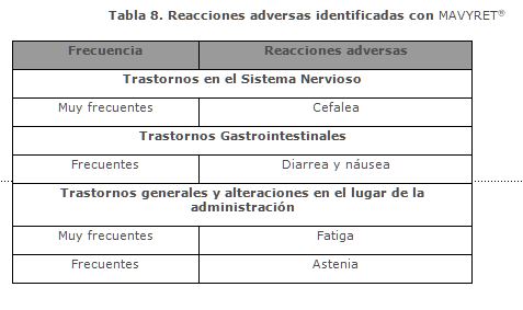 Reacciones secundarias y adversas: Resumen del perfil de seguridad: La evaluación de la seguridad de MAVYRET® en los pacientes con enfermedad hepática compensada (con o sin cirrosis) tratados durante 8, 12 o 16 semanas se basó en estudios de fase II y III en los que participaron aproximadamente 2.300 pacientes. Las reacciones adversas notificadas con mayor frecuencia (incidencia ≥ 10%) fueron cefalea y fatiga. Menos del 0,1% de los pacientes tratados con MAVYRET® presentaron reacciones adversas graves (accidente isquémico transitorio). La proporción de pacientes tratados con MAVYRET® que interrumpieron de forma permanente el tratamiento debido a reacciones adversas fue del 0,1%. El tipo y la intensidad de las reacciones adversas en los pacientes con cirrosis fueron, en general, similares a los de los pacientes sin cirrosis.Tabla de reacciones adversas: Las siguientes reacciones adversas se identificaron en pacientes tratados con MAVYRET®. A continuación se enumeran las reacciones adversas según el sistema de clasificación de órganos y por frecuencia. Las frecuencias se definen del siguiente modo: muy frecuentes (≥1/10), frecuentes (≥ 1/100 a < 1/10), poco frecuentes (≥ 1/1.000 a < 1/100), raras (≥ 1/10.000 a < 1/1.000) o muy raras ( < 1/10.000).