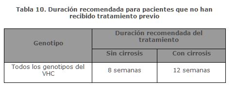 En un análisis agrupado de pacientes sin cirrosis no tratados previamente (datos de estudios de fases II y III) en el que se evaluó la RVS12 de acuerdo con la presencia de A30K basal, se detectó una tasa de RVS12 numéricamente menor en los pacientes con A30K tratados durante 8 semanas que en los tratados durante 12 semanas (78% [14/18] frente al 93% [13/14]).