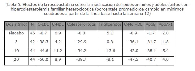 Al final de la semana 40 de la fase abierta, se logró el objetivo de C-LDL menor de 110 mg/dL (2.8 mmol/L), con una dosis de hasta un máximo de 20 mg una vez al día en 70 de 173 pacientes (40.5%). Después de 52 semanas del estudio con el tratamiento no se detectó ningún efecto sobre el crecimiento o la maduración sexual (véase Precauciones generales).
